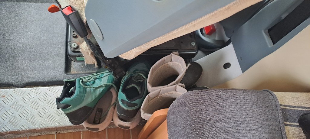 Autossani on suuri takatalli, jossa säilytän ison osan tavaroista. Siellä ovat vesikanisterit, koiranruokasäkit, työkalut (niitä on muuten kertynyt melkoisesti, koska korjattavaa aina ilmaantuu) ja muut välineet, joilla matka jatkuu ja sujuu mukavasti.