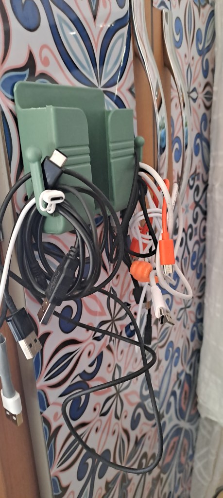 Lisäksi on hyllyjä, joissa säilytän nopeasti tarvittavia mutta ei rikkoutuvia tai painavia asioita, kuten pientä taskulamppua, karttaa ja pikastarttiakkua. Koukuissa roikkuu vaatteita ja pyyhkeitä.