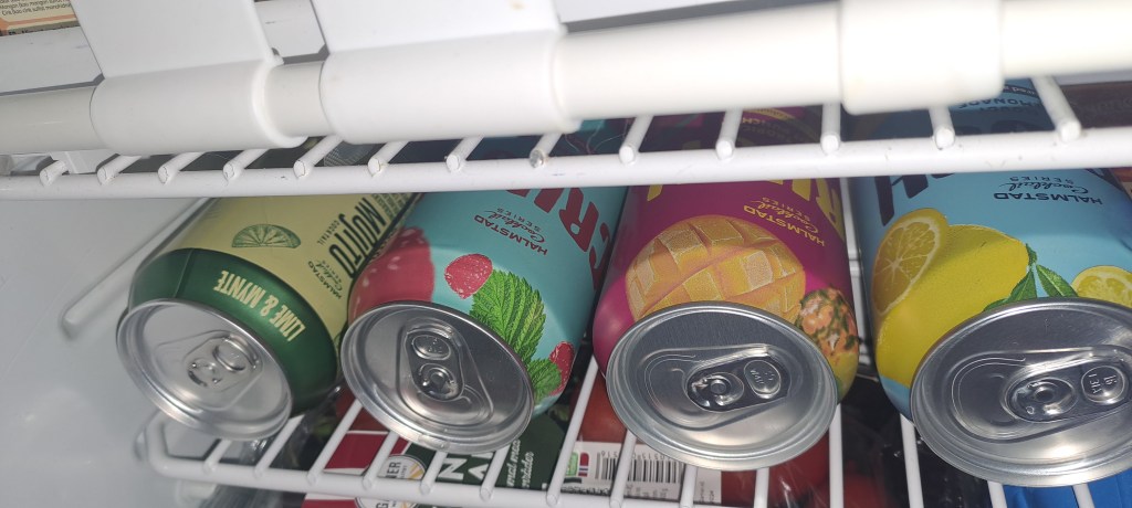 Jääkaappikin minulla tietysti on – se toimii kaasulla, sähköllä tai hupiakulla tilanteen mukaan. Reissussa pidin sitä kaasulla. Sinne ostelin Norjasta tuoretavaraa, kuten kasviksia, ja margariinia sekä norjalaista makeaa mesjuustoa. Avattu kaurajuoma säilyy jääkaapissa ja jätskit sekä koirien lihapullat pakastelokerossa.