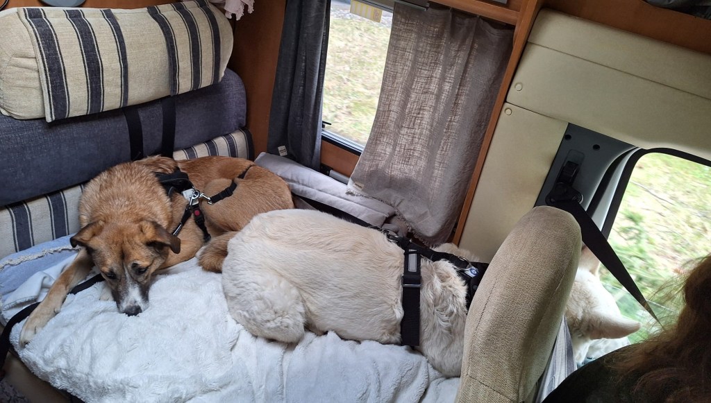 Koirilla pitää olla turvavyöt siinä missä ihmisilläkin. Hankin tälle reissulle kolaritestatut versiot, sillä yllätyksekseni kaikki koirien turvavyöt eivät täytä turvavaatimuksia.