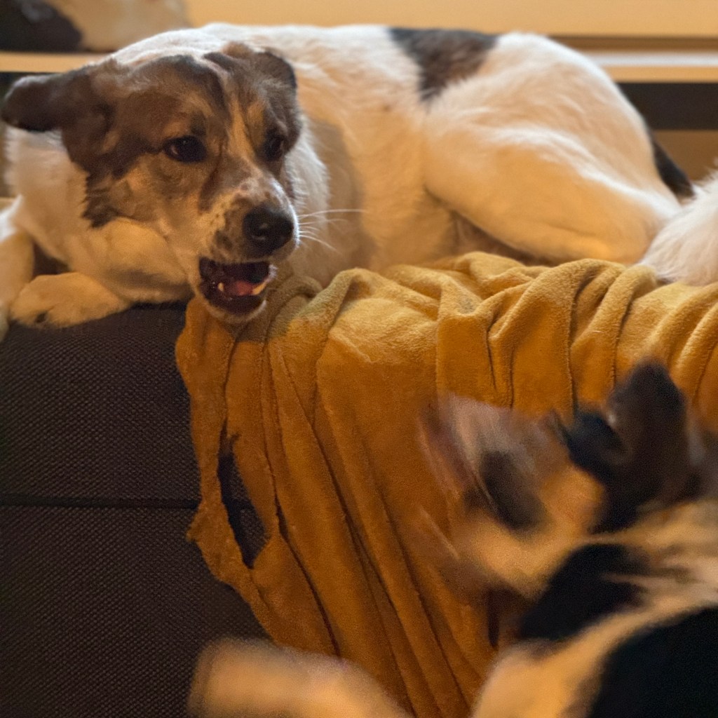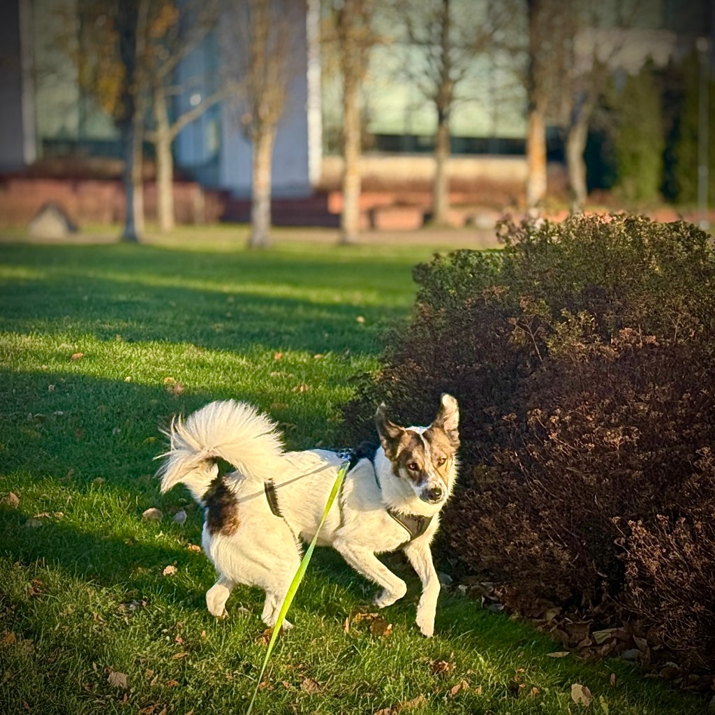 En ole suuremmin kouluttanut Tessaa istumaan, antamaan tassua tai muuta sellaista, koska mielestäni koira saa olla koira. Istuminen ja maahanmeno sekä tietysti ”paikka” ja ”tänne” olisivat hienoja taitoja, mutta tämä nykyinen tilanne on kompromissi villin koiran ja ihmisen elämän toiveiden välimaastossa.